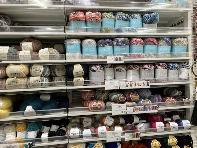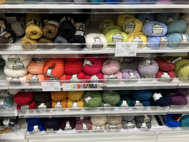 毛糸はメーカー別の陳列になっていて探しやすい。(以前は「太さ」別の陳列になっていた)