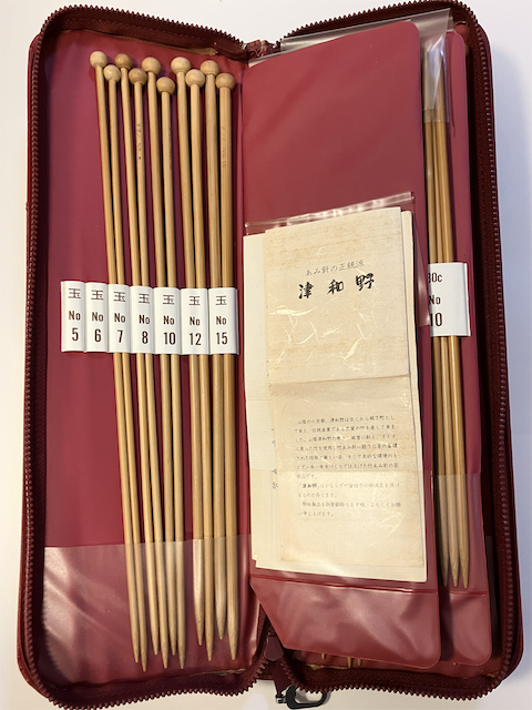 実家の母が使っていない棒針のセットを送ってくれた。赤いカバーに「津和野」と書いてある。